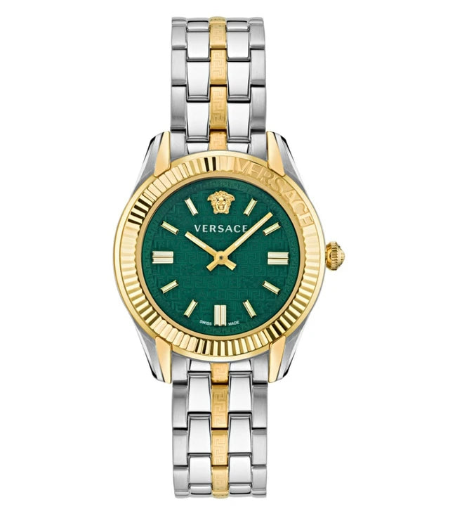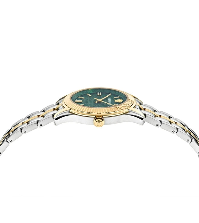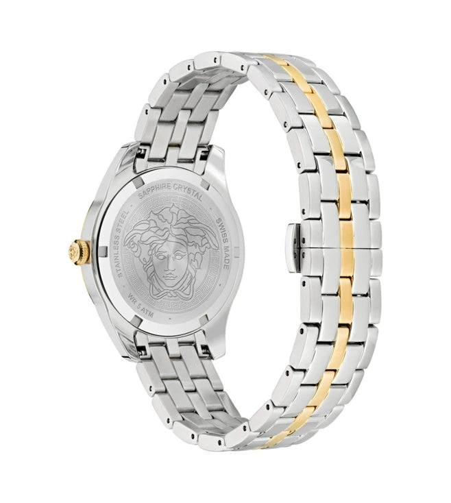 This delicate watch is crafted in a timeless style. Enriched with a sleek dial of height 35 mm and case thickness 7.5 Mm, the roman numerals and a medusa at the 12h position, this watch is designed with a traditional sensibility. The watch case is encircled by the greca pattern on the inner dial and top ring for an iconic look.