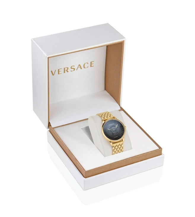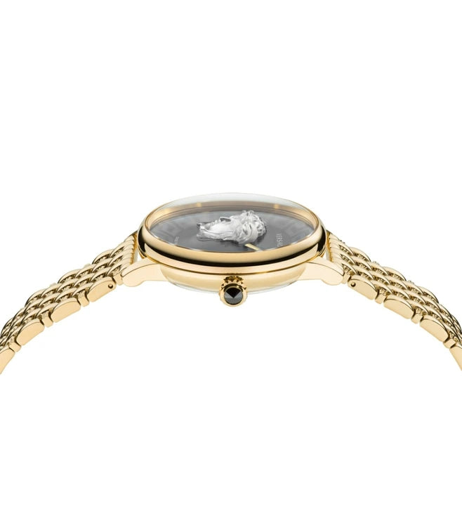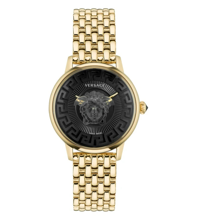 This delicate watch is crafted in a timeless style. Enriched with a sleek dial of height 38 mm and case thickness 12.8 Mm, the roman numerals and a medusa at the 12h position, this watch is designed with a traditional sensibility. The watch case is encircled by the greca pattern on the inner dial and top ring for an iconic look.