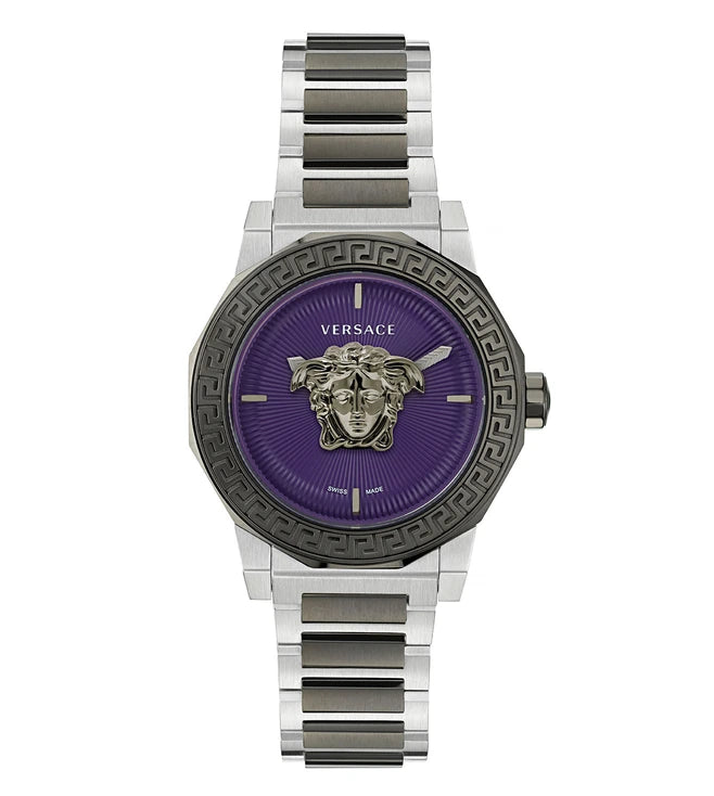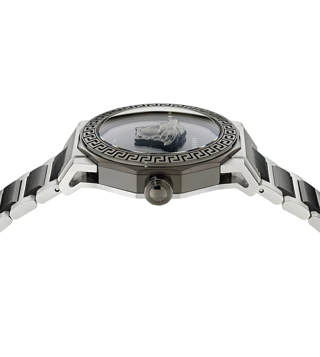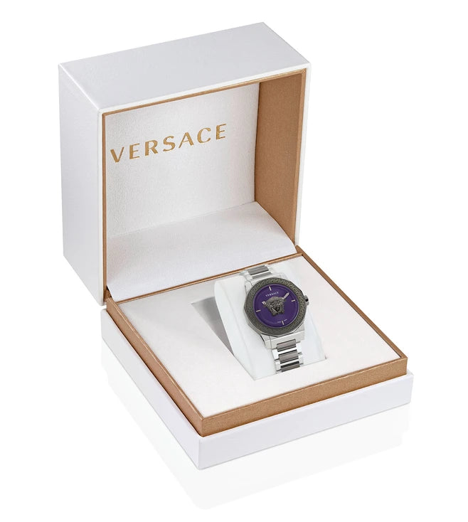 Give your wrist a stunning look with this watch from Versace. Housed in a 38 mm case, the dial is shielded with mineral glass and runs on a quartz movement. It is water resistant up to 50 m. Featuring an iconic design, this classic watch has a three-dimensional Medusa on the guilloche dial. The top ring is further decorated with the Greca to strengthen the connection with Versace's DNA.