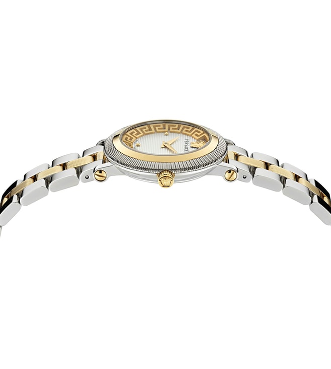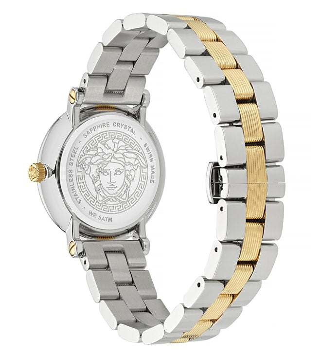 Amaze everyone around you by wearing this women's analog watch from Versace. The white round dial is protected by a sapphire crystal with anti-reflective coating. It has a crown for time adjustment. The stainless steel strap comes in a two tone hue that further elevates the look of the timekeeper. Besides, it is completed with a fold-over clasp to ensure a secure fit on the wrist.