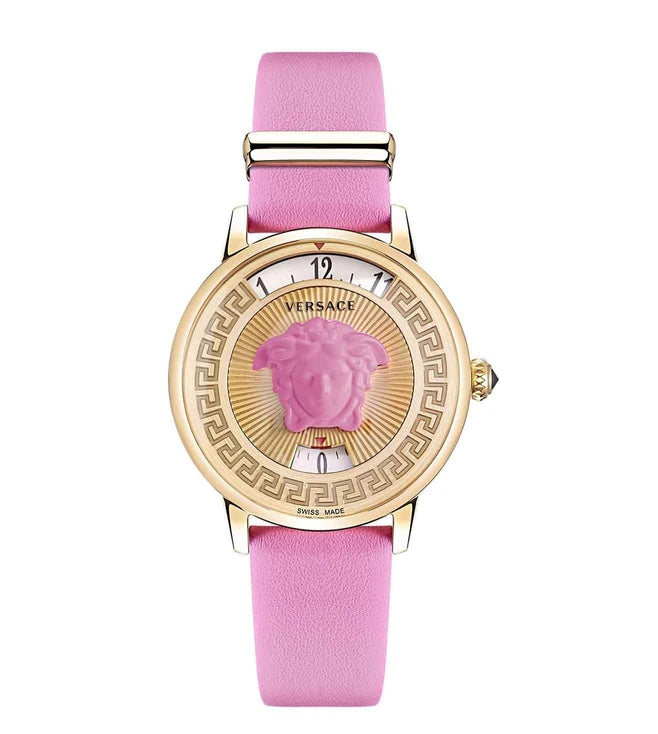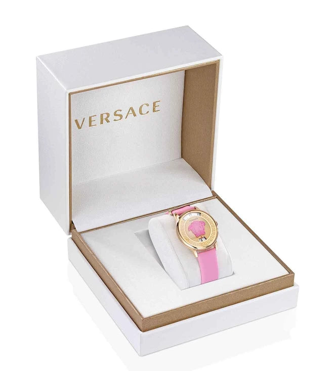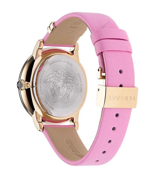 An iconic watch whose beauty is enhanced by the use of the Medusa head that stands with elegance in the center. A contemporary and iconic design code come together to give the product a distinctive look, bringing once again to light the splendor of this versace icon the medusa. The disc is covering the dial where hours are readable at 12 and minute at 6 o'clock. Wear something different to feel unique. A charming leather strap and beautiful dial add the elegance.