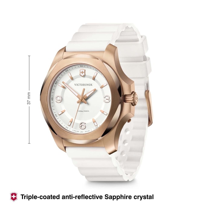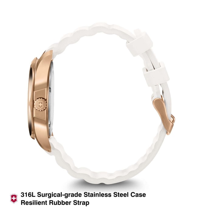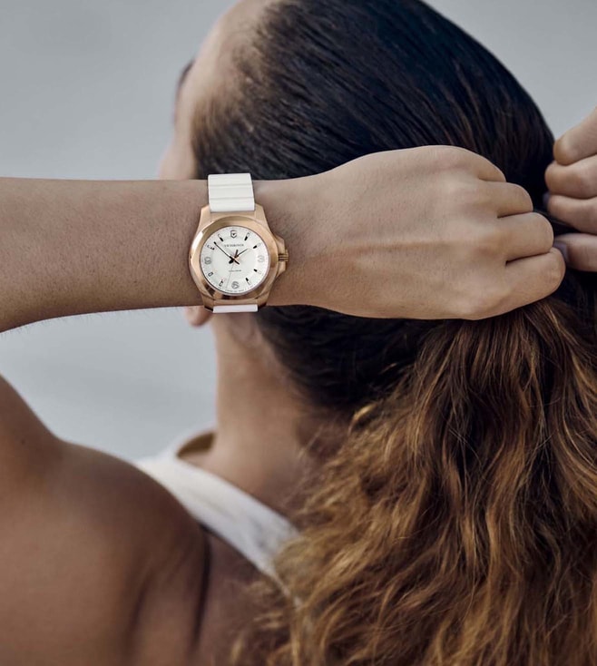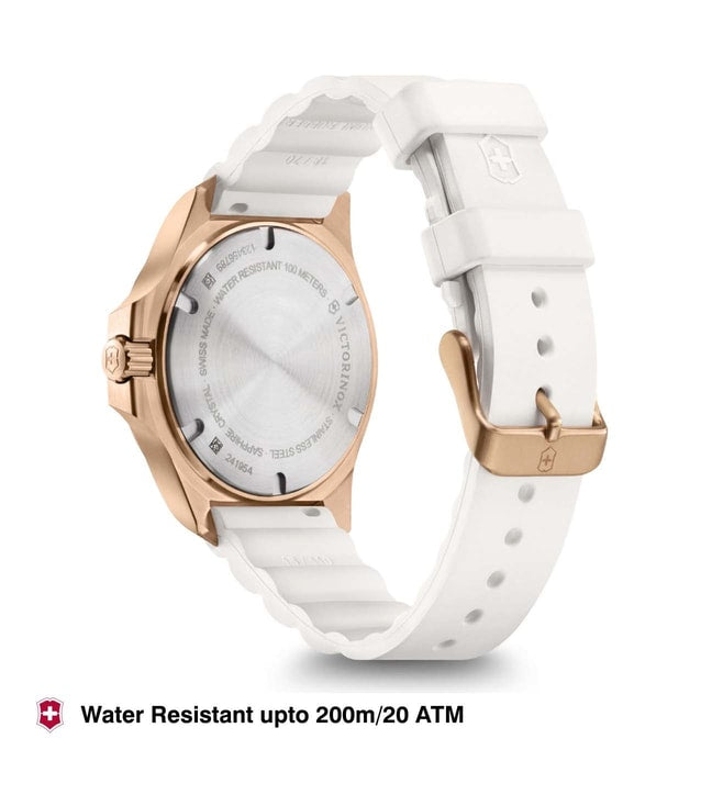 Victorinox introduces this ultimate lightweight and adventure-tough I.N.O.X. V watch which is a must-have. Forward-thinking, functional and beautiful in form, this Swiss-made timepiece sets a new benchmark in feminine horology. Taking the bold iconic design of the original I.N.O.X. V, it reinvents it for the discerning female globe-trotter. Weighing 32 percent lighter and 33 percent slimmer with a resistant rubber strap with an easy release bar system for smooth strap removal and replacement, it is effortless wristwear for you.