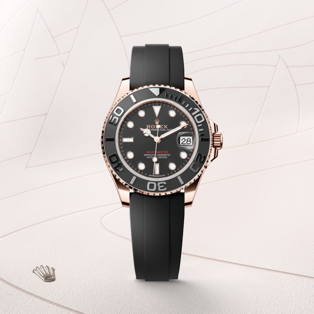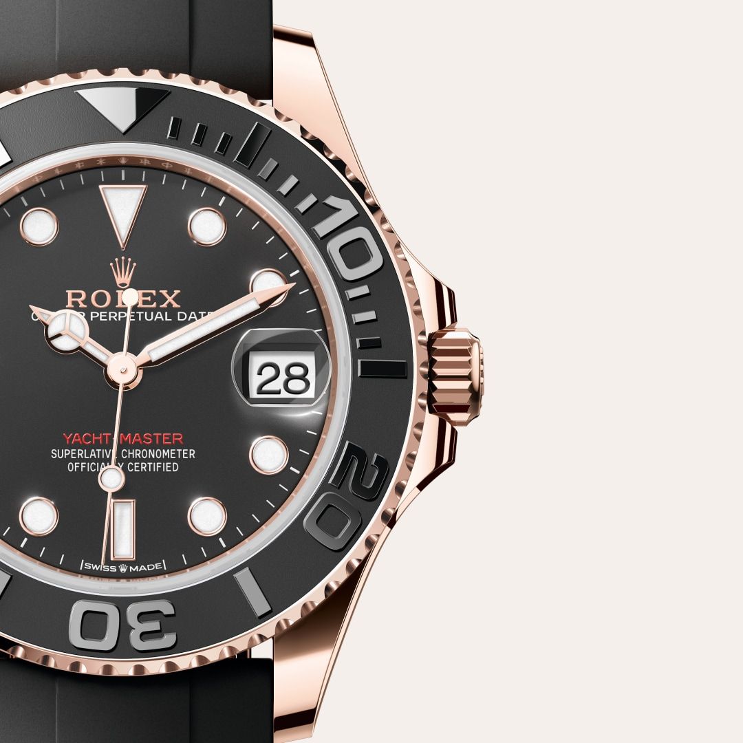 The Yacht-Master’s new Oysterflex bracelet, developed by Rolex and patented, offers a sporty alternative to metal bracelets. The bracelet attaches to the watch case and the Oysterlock safety clasp by a flexible titanium and nickel alloy metal blade. The blade is overmoulded with high-performance black elastomer which is particularly resistant to environmental effects, very durable and perfectly inert for the wearer of the watch. For enhanced comfort, the inside of the Oysterflex bracelet is equipped with a patented longitudinal cushion system that stabilizes the watch on the wrist and fitted with an 18 ct Everose gold Oysterlock safety clasp. It also features the Rolex Glidelock extension system, designed by the brand and patented. This inventive toothed mechanism, integrated beneath the clasp, allows fine adjustment of the bracelet length by some 15 mm in increments of approximately 2.5 mm, without the use of tools.