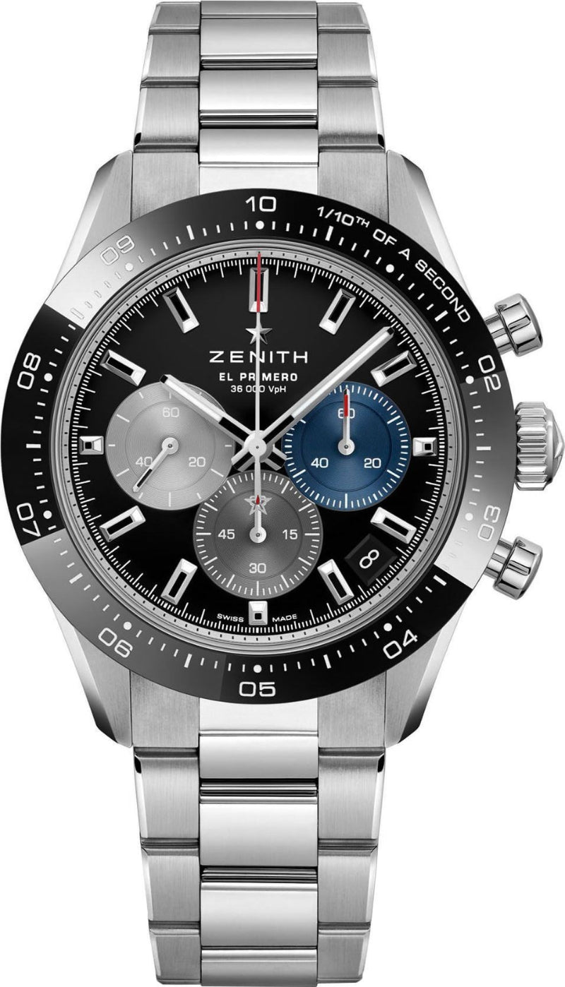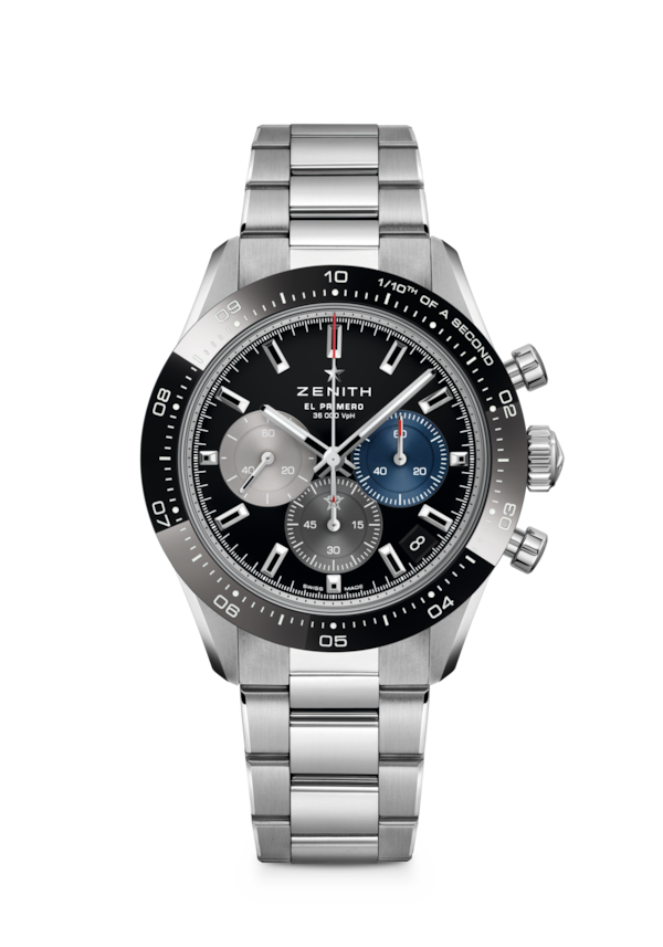 The CHRONOMASTER Sport combines elements of past ZENITH chronograph references such as the tri-colour dial, pump-style pushers and steel bracelet with a black ceramic bezel, all in a modern 41mm case. This version features a black dial paired with an integrated steel bracelet. Powered by the El Primero 3600 1/10th of a second automatic chronograph movement.