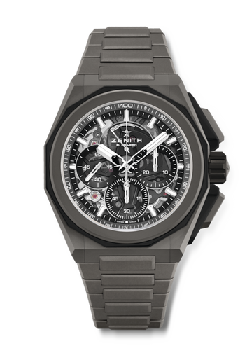 The DEFY Extreme 1/100th of a second chronograph is made in light yet robust titanium with an entirely matte finish. The tinted sapphire dial with applied counters reveals the El Primero 21 automatic movement with two escapements beating at 50Hz and 5Hz. The DEFY Extreme watch comes with a titanium strap as well as a rubber strap and a Velcro strap.