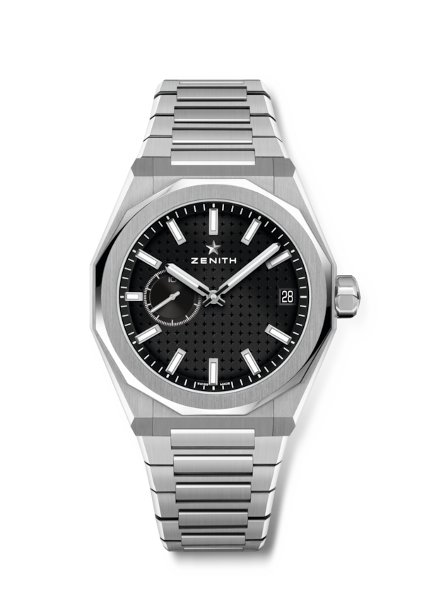 DEFY Skyline in a 41mm steel octagonal case with a faceted bezel, featuring a black-toned sunburst-patterned dial revisiting the emblematic ZENITH four-pointed star. Powered by the El Primero 3620 high-frequency automatic manufacture movement with the very first 1/10th of a second indicator. Interchangeable steel bracelet and black patterned rubber strap.